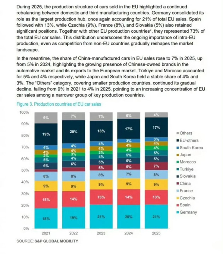 4月6日,欧洲汽车制造商协会(ACEA)发布《2025年度经济与市场报告》,一组数据刷新了全球汽车产业的历史:2025年欧盟从中国进口汽车数量达1,006,188辆,同比增长30.7%,首次突破百万辆大关;中国产汽车在欧盟市场份额从2022年的5%攀升至7%,稳居欧盟最大汽车进口来源国地位。与此同时,韩系、日系品牌在欧份额停滞不前,中国车企的攻势正在彻底重塑欧洲汽车市场格局。